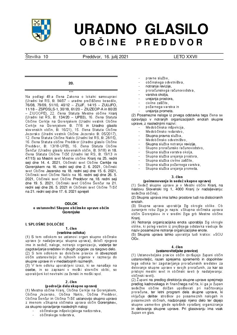 Odlok o ustanovitvi Skupne občinske uprave občin Gorenjske (Uradno glasilo Občine Preddvor - Številka 10/2021)