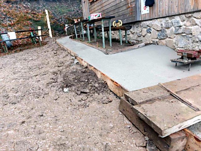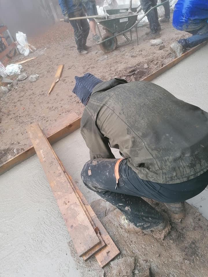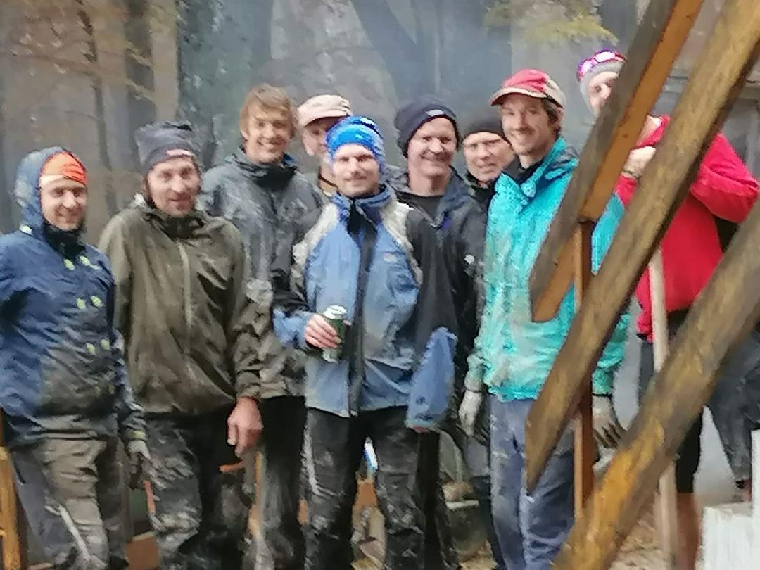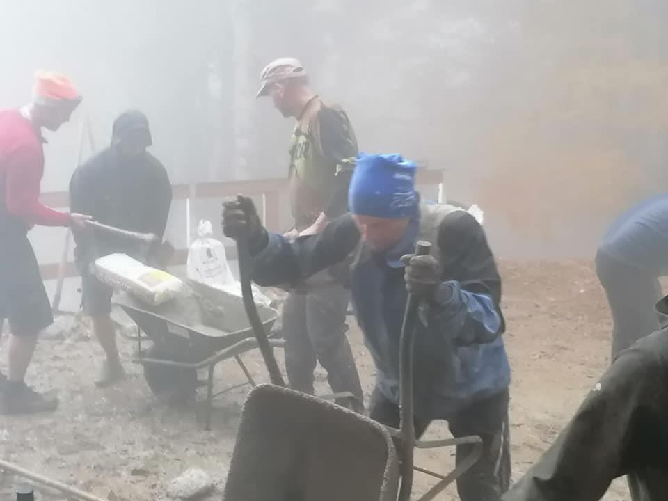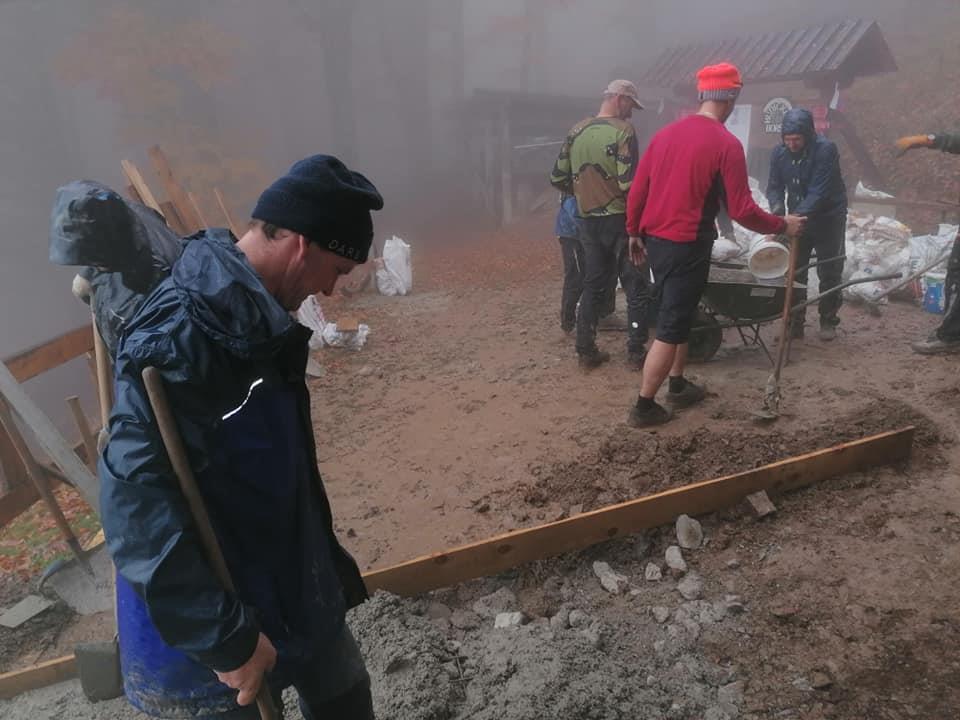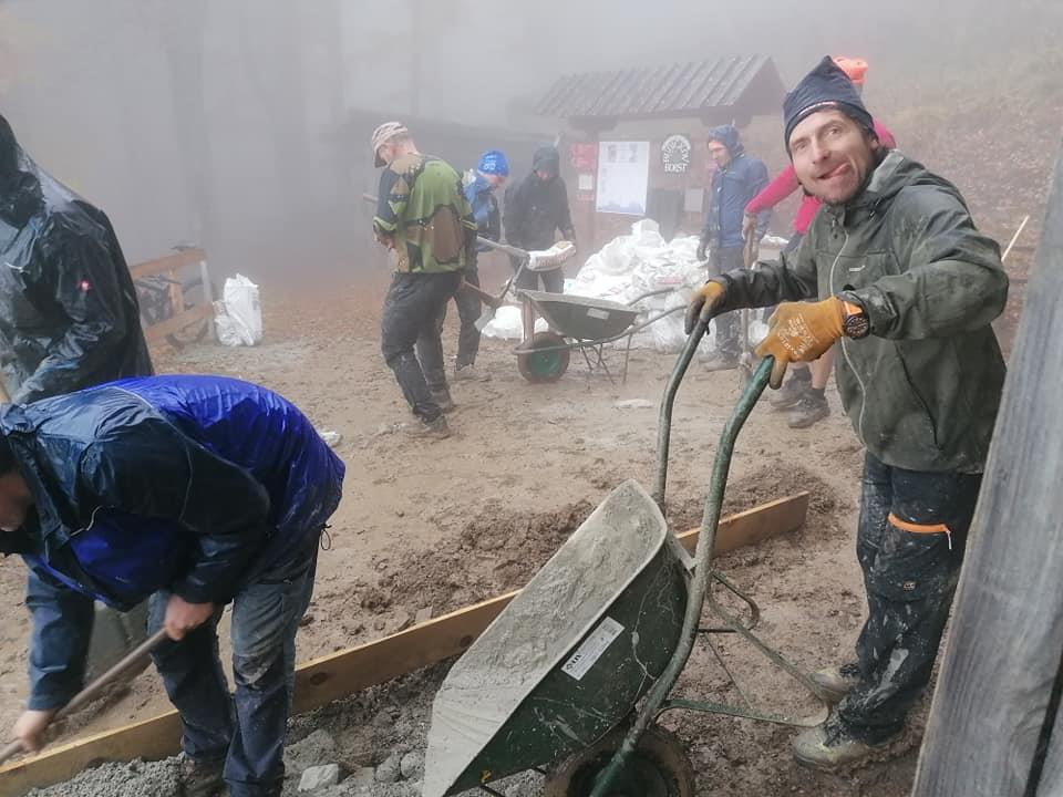Tudi včeraj so bili trmasti do konca! Okoli koče jim je uspelo skopati kamnito peščeni teren do pravšnje globine, da so potem trasirano pohodno pot lahko zalili z betonom. In tudi na koncu popoldneva, ko je Ivan Šenk na traso vrgel zadnjo lopato betona, so bili fantje in možje do konca premočeni in blatni, vendar v dno srca še pa še zadovoljni, da so zmogli narediti tisto, kar so obljubili.