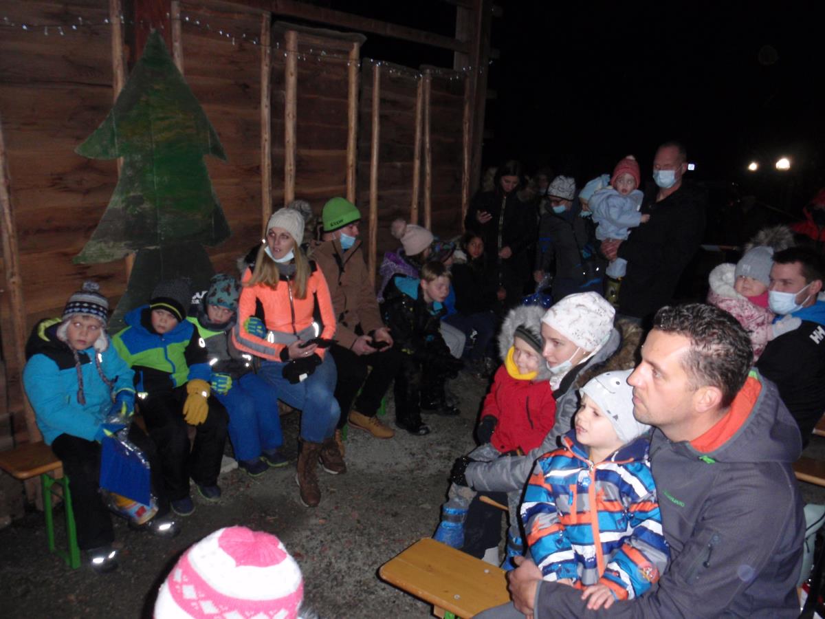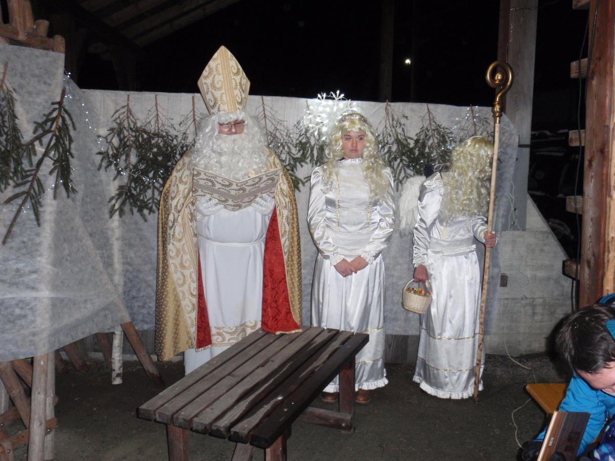 Mengarjev Domen je prebral čudovito pravljico, z glasom, občutkom in pravim igralskim talentom, kot bi prišel iz Prešernovega gledališča. Otroci so z glasnim klicanjem končno le priklicali Miklavža. Seveda ni prišel sam. V spremstvu je imel Luciferja in ostale parkeljne, na vsaki strani pa po enega angela varuha. Miklavž je bil tudi bolj skromen. Obdaril je samo predšolske otroke. Kar štirinajst se jih je nabralo. Navkljub vsemu je bilo veselja in radosti za poln koš.