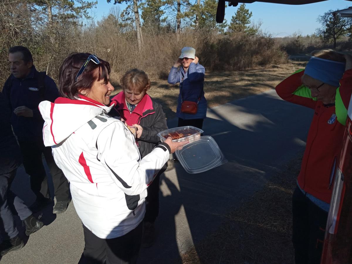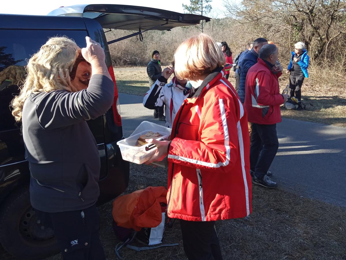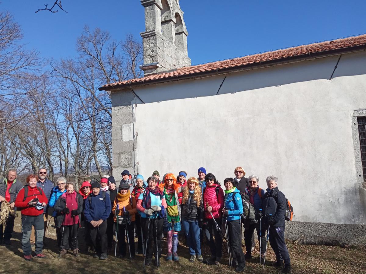 Potem se je začela resnično uživaška hoja po kraškem svetu mimo številnih pašnikov z živalmi, kamenjem in vse je hitro minilo ob pustnem pogovoru. Naš prvi postanek in ogled je bil pri cerkvi Marije Snežne. O njenem nastanku obstaja več legend. Prva pravi, da naj bi v četrtem stoletju isto noč papež in bogati Rimljan Ivan sanjala, da jima je Marija naročila, naj zgradijo cerkev na kraju, kjer bo 5. avgusta zapadel sneg. Tega dne naj bi res zapadel sneg na vzpetini, kjer so nato okoliški prebivalci zgradili cerkev. Druga legenda pravi, da naj bi se Marija prikazala ljudem na vzpetini, o čemer še danes priča viden odtis noge v kamnu na stezi sredi hriba, preden se pride do stopnic in obzidja. Tretja legenda pripoveduje o napadu turških konjenikov, ki so pridirjali pred cerkev. Pred vrati cerkve se je konj poveljnika ustavil in se zasukal. Kopito se mu je vdrlo v živo skalo. Ta odtis konjskega kopita v kamnu je viden nedaleč od vhoda v cerkev na zahodni strani. Od tu smo se usmerili proti utrdbi Črni kal in se razdelili v dve skupini, eni za zahtevnejšo in drugi malo lažjo ravninsko pot. Utrdba se nahaja na trideset metrov visoki skali, ki je nekoč bila dostopna le preko štirimetrskega dvižnega mostu. V 11. stoletju ga je dal sezidati istrski mejni grof Ulrik I, da bi tako nadziral pomembne strateške poti. Ruševine utrdbe so na strmi skali, ločeni od Kraškega roba, ki ju je nekoč povezoval dvižni most. Danes so ostanki utrdbe ponovno dostopni preko kovinskega mostu. Pri utrdbi smo imeli počitek z malico in nadaljevali pot skupno naprej krožno do naših kombijev. Pri smerokazu za Marijo Snežno se je krog zaključil in le še malo poti je bilo do kombijev, kjer so nas še čakale preostale sladke dobrote.