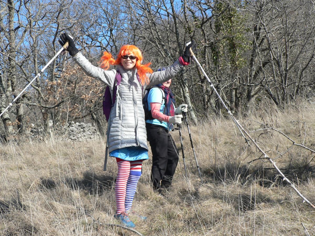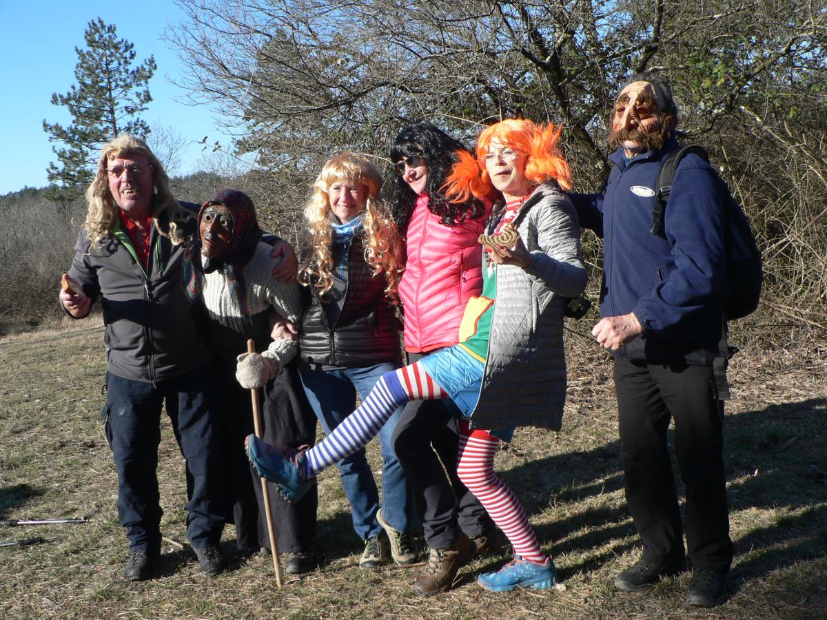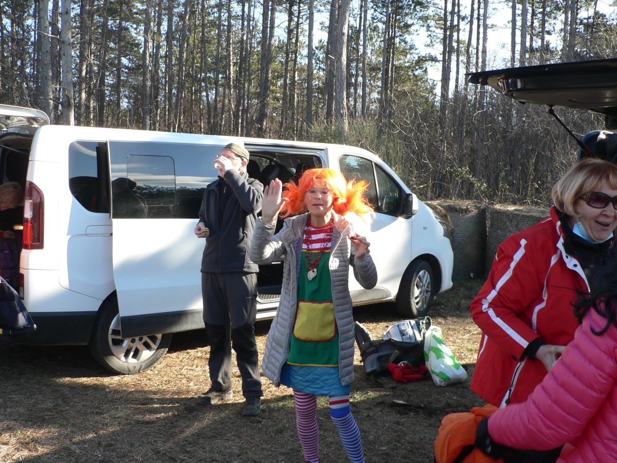 Ob osmi uri smo se odpeljali iz Preddvora in po uri in pol vožnje do Praproč smo doživeli preobrazbo v vse smeri. Nekateri so se pomladili v mladenke in drugi v »stare babe in dedce«, vse pa je zabavala poskočna Pika Nogavička. Za še boljše razpoloženje s krepkim napitkom in sladkimi dobrotami sta poskrbela slavljenca, Janez Sluga in okroglo-obletnica, 70-letnica Jadranka Vrtlar. Čestitke obema kar na začetku, ker smo se resnično dobro opomogli za hojo za naslednji dve uri. Seveda smo se tudi slikali, saj je bila naša raznovrstnost resnično velika, zasluga pa gre tudi Franciju Šenku, ki je s seboj pripeljal lasulje in maske, ki so bile takoj »razprodane«.