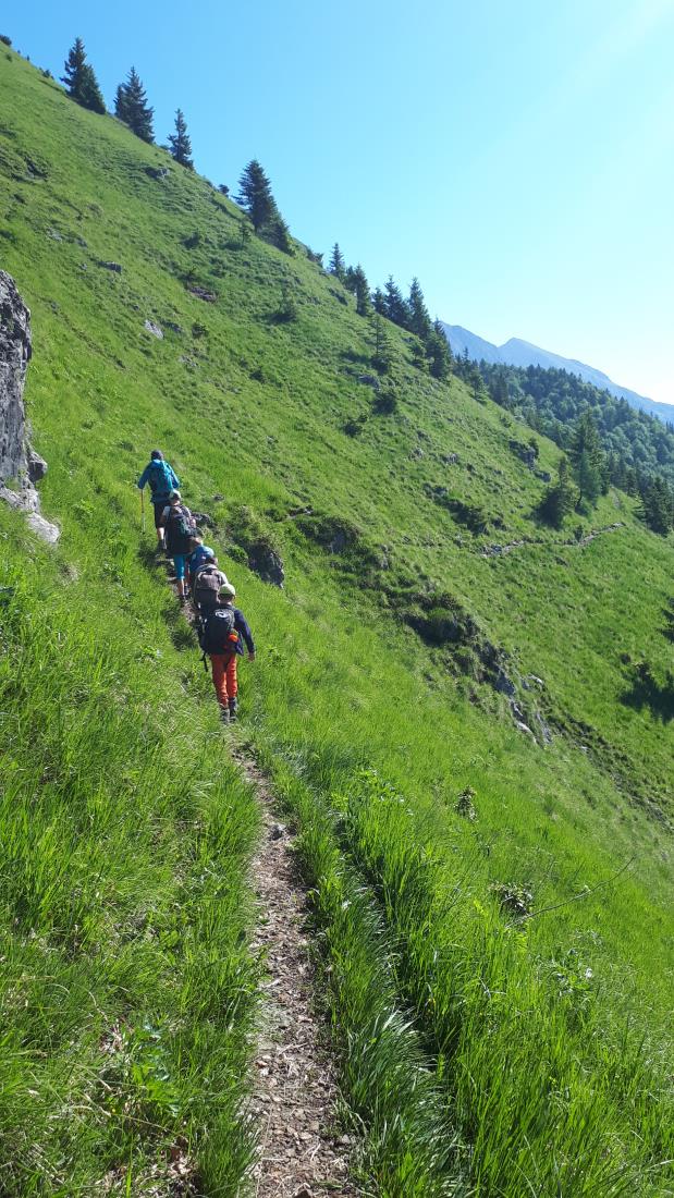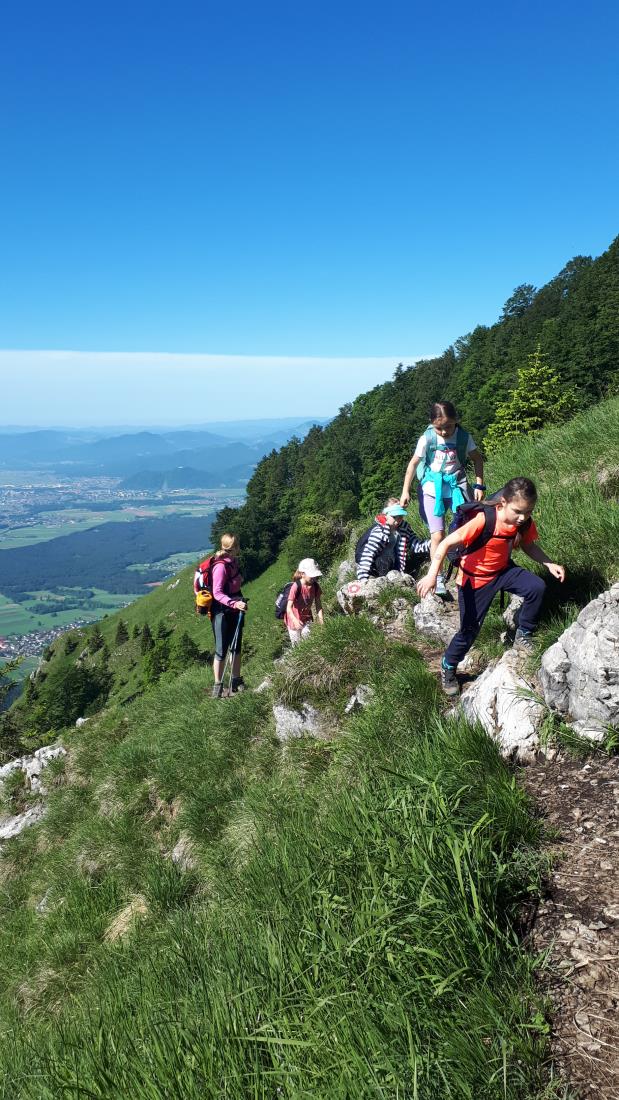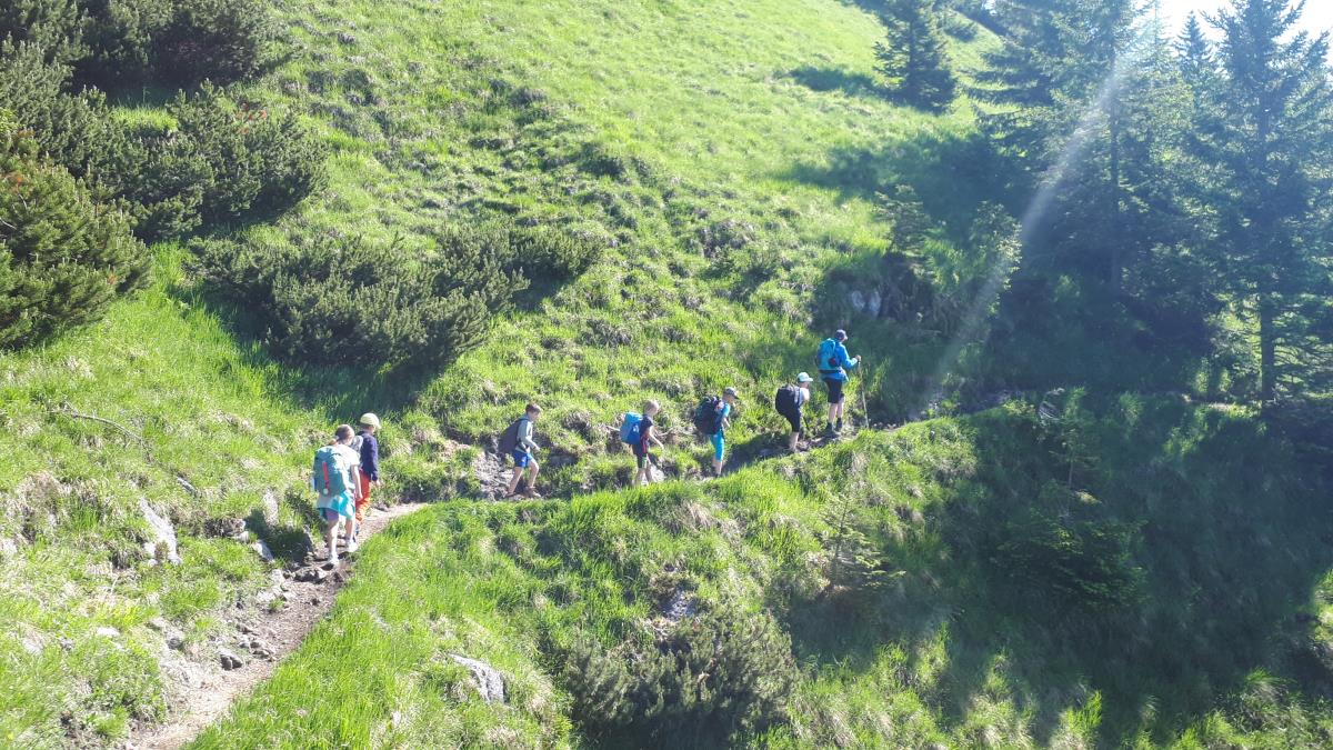 Zjutraj je bil čas za raziskovanje okolice zavetišča in igro, spustili smo se do helidroma, pri studencu pa si priskrbeli nove zaloge vode za na pot. Poslovili smo se od Rajka, zbrano in previdno smo krenili proti Javorovemu vrhu ter naprej proti Jakobu. Občudovali smo lepe razglede, strma pobočja, mravljišča, potipali nežne iglice macesnov... Žal pa nesreča kljub vsej previdnosti ne počiva. Tokrat se je v obliki spolzke korenine malce nad Jakobom nastavila Niku, ki je ob padcu poškodoval roko. Ob pomoči Janeza iz PD Preddvor je pogumni fantič našo pustolovščino predčasno zaključil, ostali pa smo srečno, pa vendarle - kljub sladolednemu presenečenju - z grenkim priokusom, sklenili planinski podvig. Vseeno pa mislim in upam, da bodo otroci svojo prvo noč v gozdičku, ki ga vsak dan gledamo iz doline, pa seveda dooolgo pot sestopa, ki jih je krepila v vztrajnosti in potrpežljivosti, ohranili v lepem spominu.