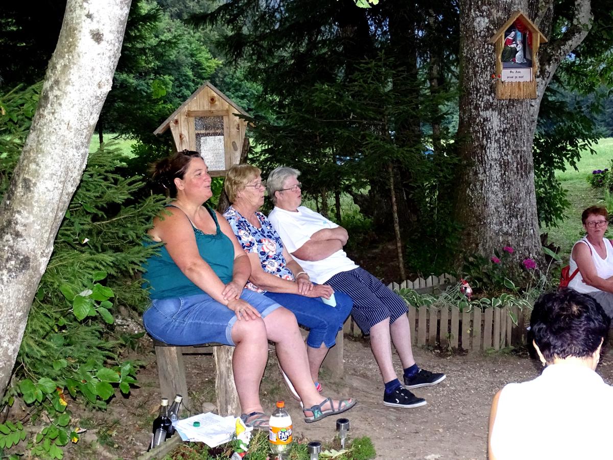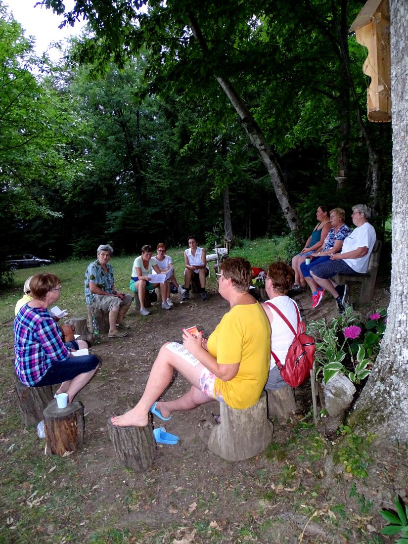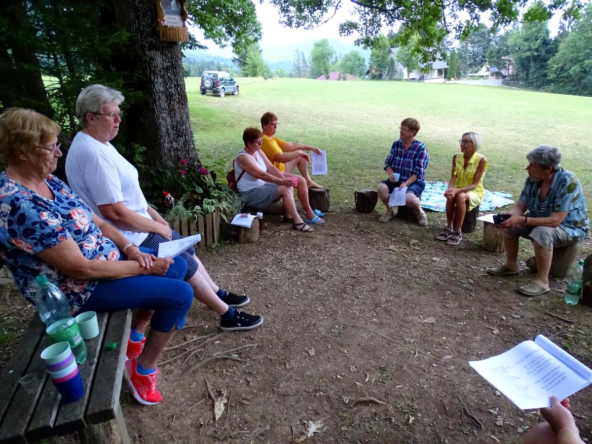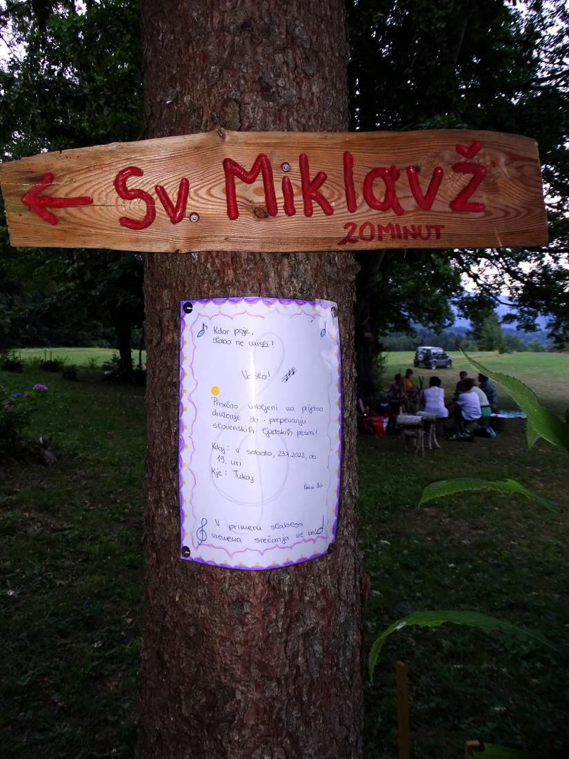 Mladost, veselje in pesem so v sobotnem večeru napolnile senožet pod gozdnim robom pod mačevsko cerkvico svetega Miklavža. Anica Arh, ki ima Pr' klopc' svoj pisani rožnati vrt, je že pred dnevi pritrdila na smrekovo deblo bel list, na katerem je pisalo: Prisrčno vabljeni na prijetno druženje ob prepevanju slovenskih ljudskih pesmi! Anica ima v sebi res velik čut in skrb do ohranjanja slovenskih ljudskih pesmi in ljubezen do ohranjanja slovenskih ljudskih običajev.