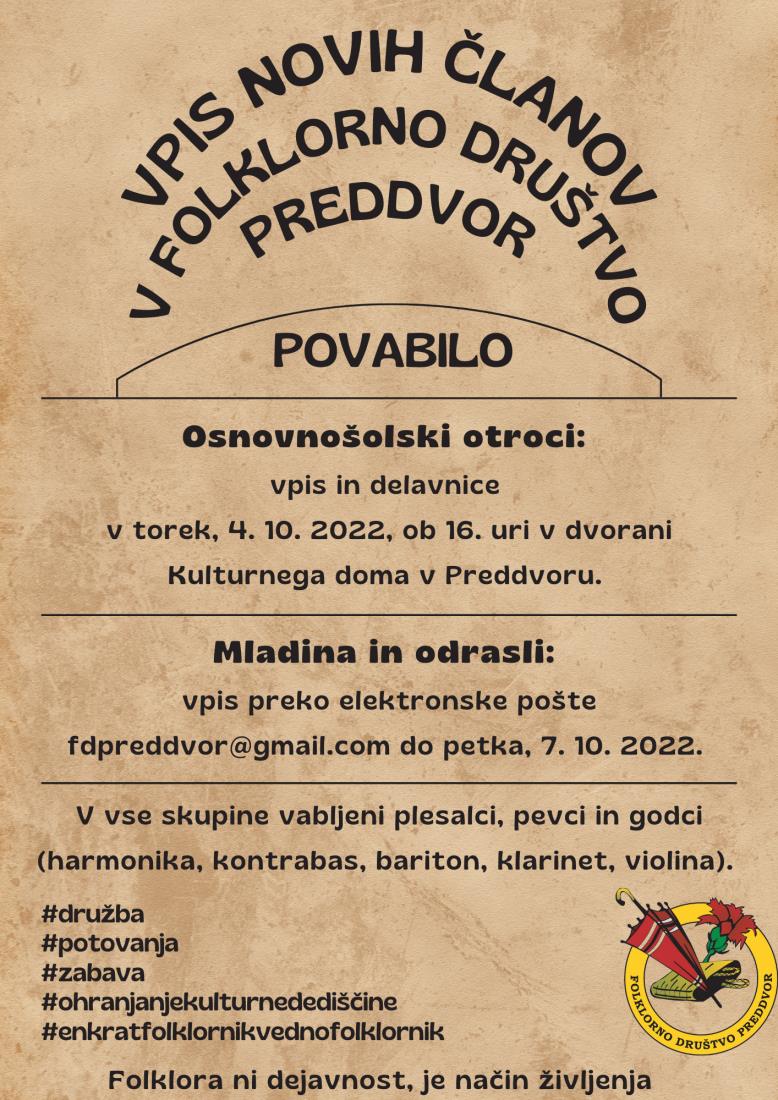Vpis in delavnice za osnovnošolske otroke bo v torek, 4.10.2022, ob 16 uri v dvorani Kulturnega doma v Preddvoru.