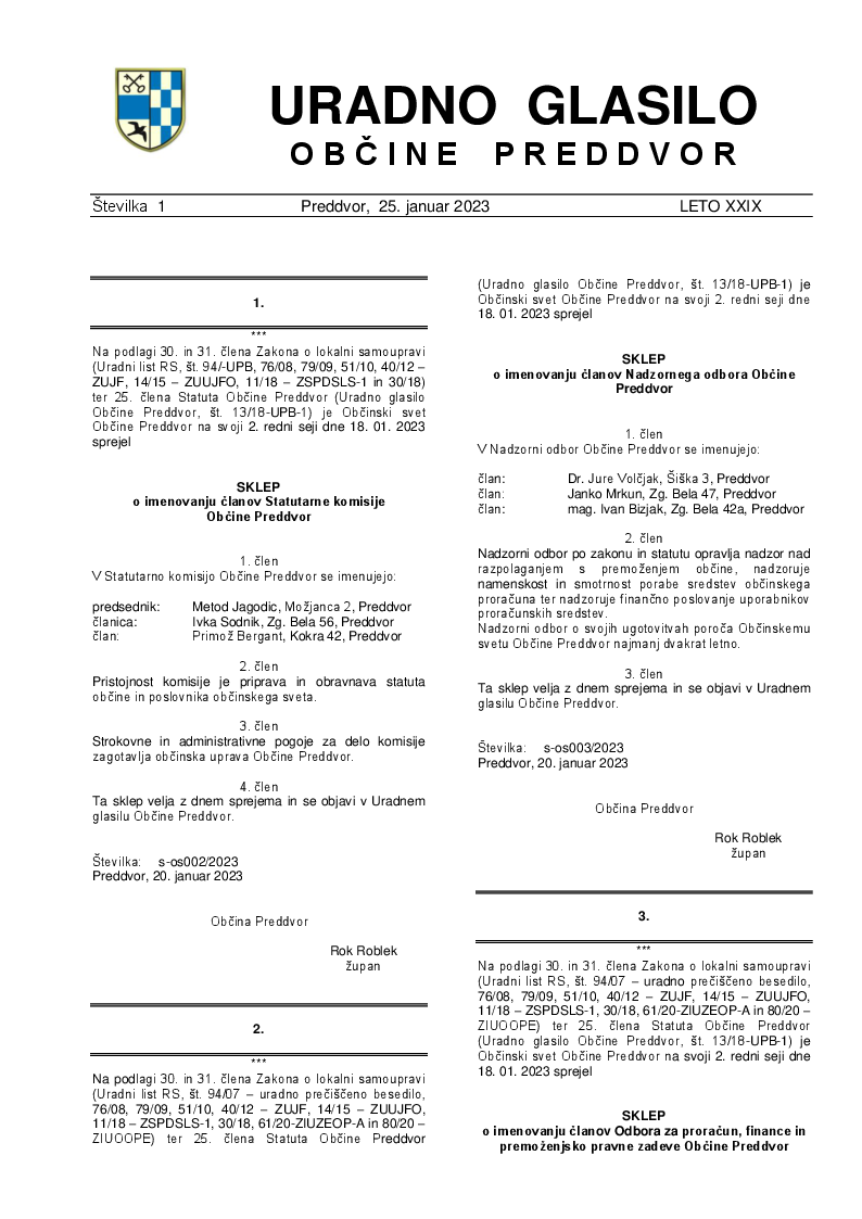 Sklep o imenovanju članov Statutarne komisije Občine Preddvor (Uradno glasilo Občine Preddvor - Številka 1/2023)