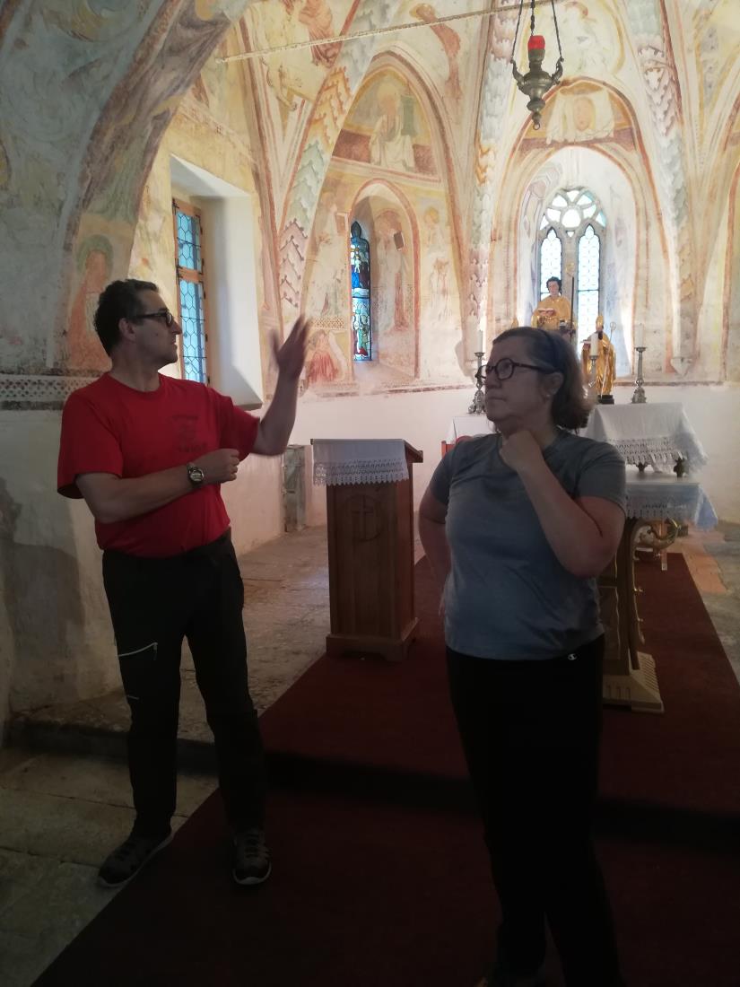 V Preddvoru smo si ogledali tudi obnovljeni grad Dvor, po katerem nas je vodila Tanja Šubelj, grofica, ki je skupaj z občino Preddvor in številnimi domačini prostovoljci v rekordnem času obnovila in opremila grad. Po okrepčilu in počitku smo pot nadaljevali na sv. Jakob.