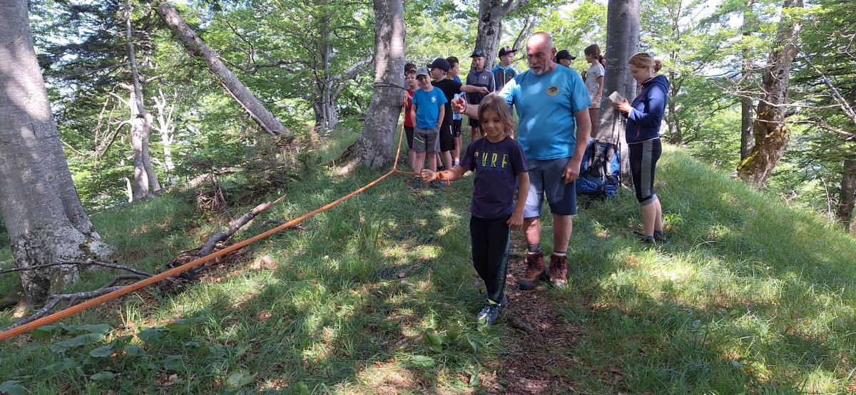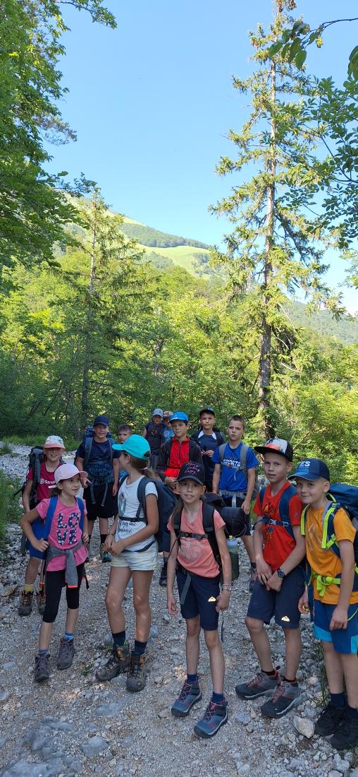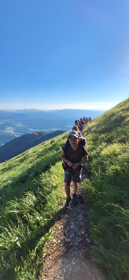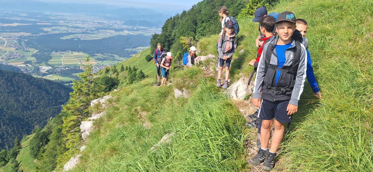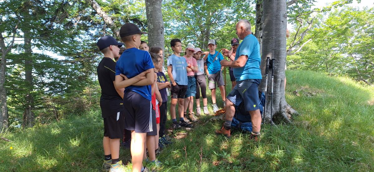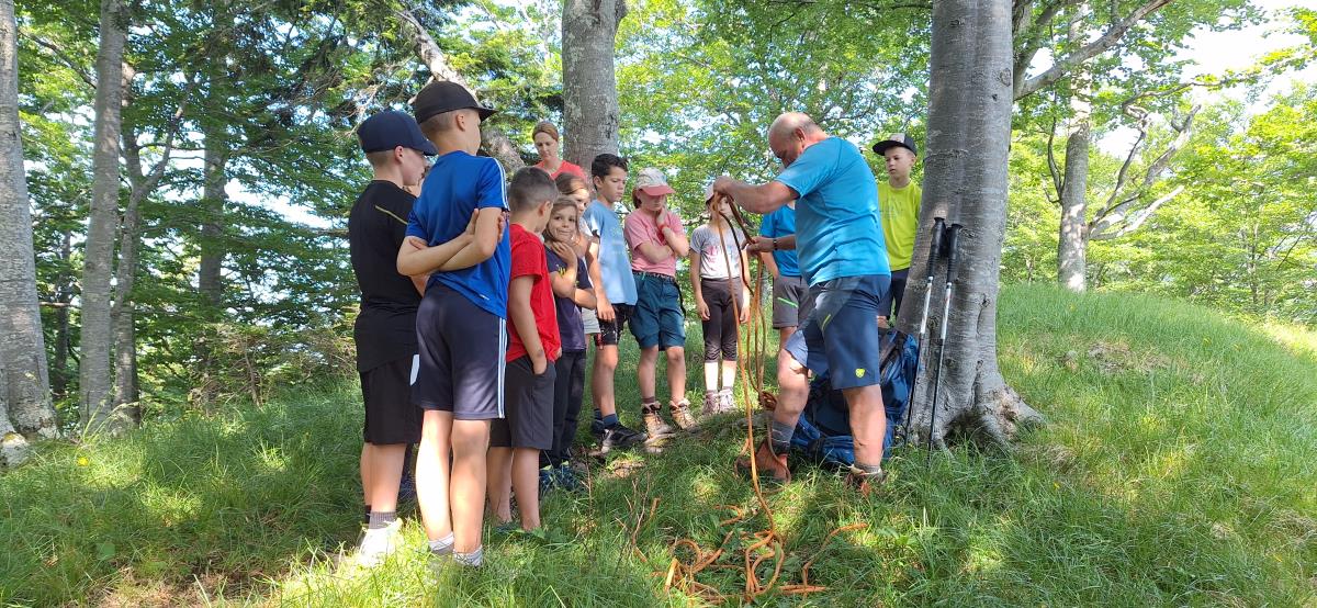 V petek zjutraj nas je čakala planinska šola v praksi. Rajko je šel z nami na pot, poslovili pa smo se od gospe Marjete in prijaznega zavetišča. Previdno smo se podali na prečno pot proti Javorovemu vrhu, na varnem grebenu pod njim pa nam je Rajko pokazal tehniko vrvne ograje in samovarovanja z vrvico. Vsak je lahko večkrat poskusil, potem pa smo se povzpeli na najvišjo točko naše ture. Po malici smo se poslovili od Rajka in fantov, ki so se vrnili na Zaplato, mi pa smo preko Potoške gore in razgledne točke sestopili do Sv. Jakoba, nato pa v Potoče, kjer so nas počakali starši.