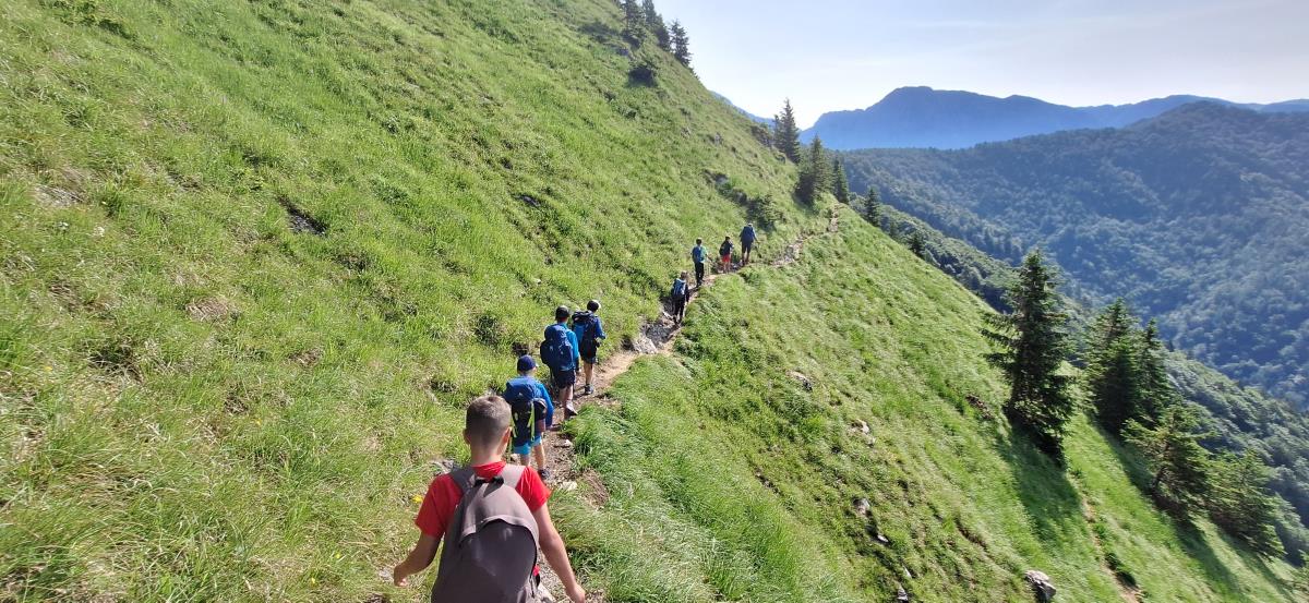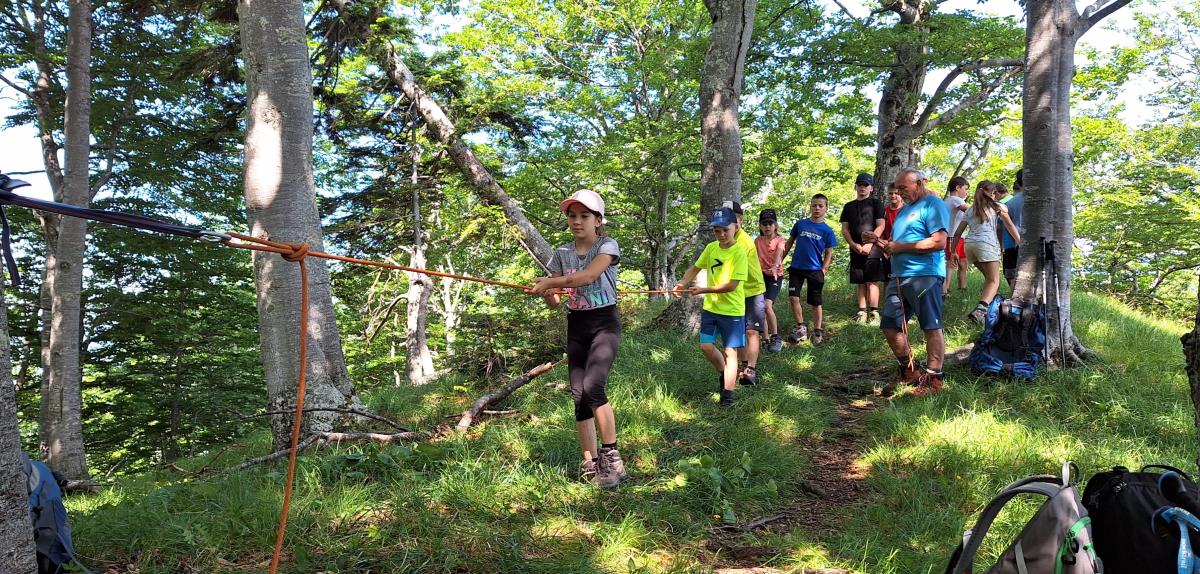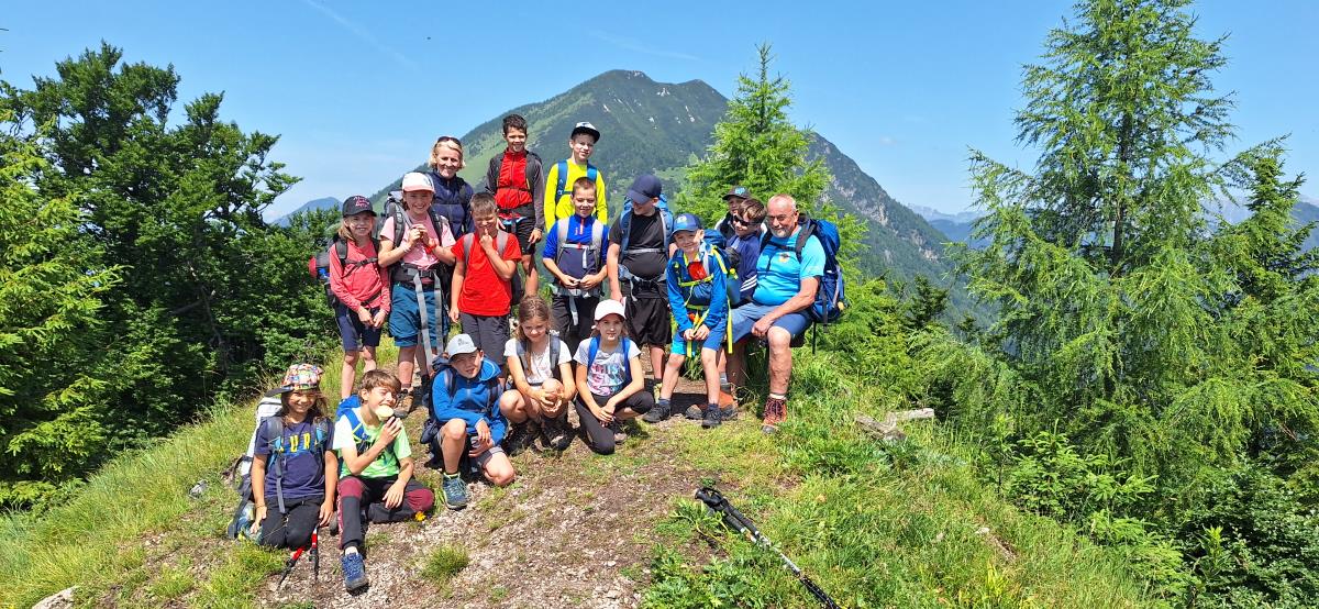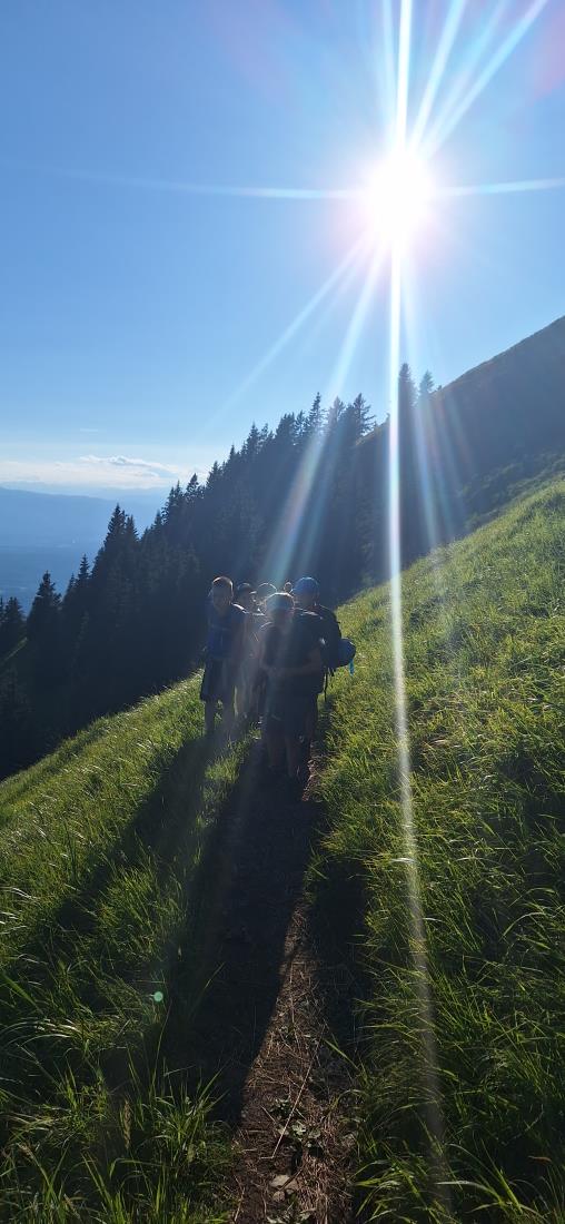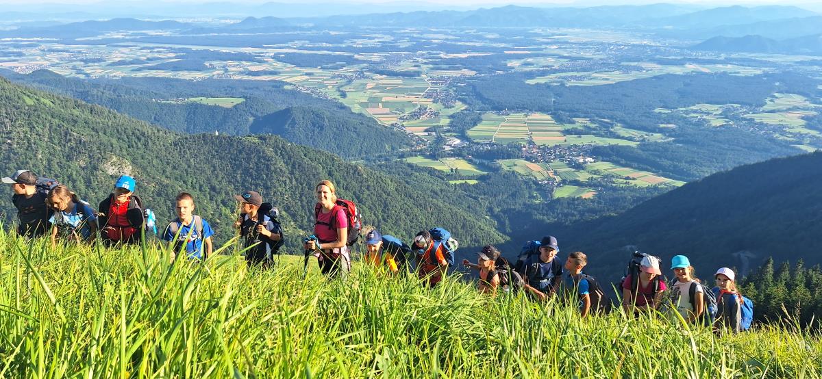 V petek zjutraj nas je čakala planinska šola v praksi. Rajko je šel z nami na pot, poslovili pa smo se od gospe Marjete in prijaznega zavetišča. Previdno smo se podali na prečno pot proti Javorovemu vrhu, na varnem grebenu pod njim pa nam je Rajko pokazal tehniko vrvne ograje in samovarovanja z vrvico. Vsak je lahko večkrat poskusil, potem pa smo se povzpeli na najvišjo točko naše ture. Po malici smo se poslovili od Rajka in fantov, ki so se vrnili na Zaplato, mi pa smo preko Potoške gore in razgledne točke sestopili do Sv. Jakoba, nato pa v Potoče, kjer so nas počakali starši.