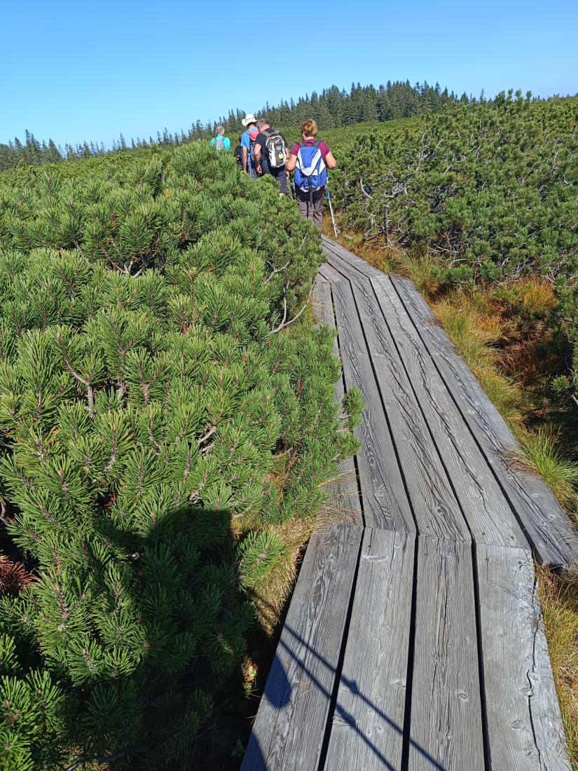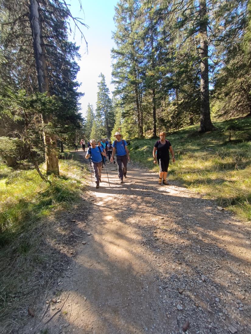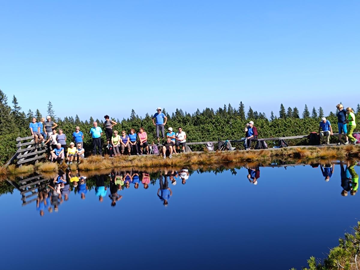 Po okrepčilu smo se podali proti naravnemu rezervatu Lovrenška jezera na višini 1520 metrov na visokem barju sredi Pohorja med Roglo in Ribniškim Pohorjem. Ko smo po gozdni poti prišli do barja, smo se najprej povzpeli na razgledni stolp, nato se sprehodili po z lesom tlakovani poti, ki omogoča hojo po suhem. Vijugali smo med večjimi in manjšimi jezerci, za katere je značilno, da vodo dobivajo izključno s padavinami. Čudovit sončen dan in zrcalno jasni odsevi v jezerih so pričarali čarobno vzdušje. Nazaj grede smo se vračali po zahodni poti čez Roglo, kjer je pot speljana po športno-rekreativni planini mimo Cerkev Jezusove spremenitve, številnih skulptur in otroških zabaviščnih naprav. Obšli smo še stolp na vrhu Rogle in sledil je le še zadnji spust do kombijev z zaključkom in zdravico slavljenkama.