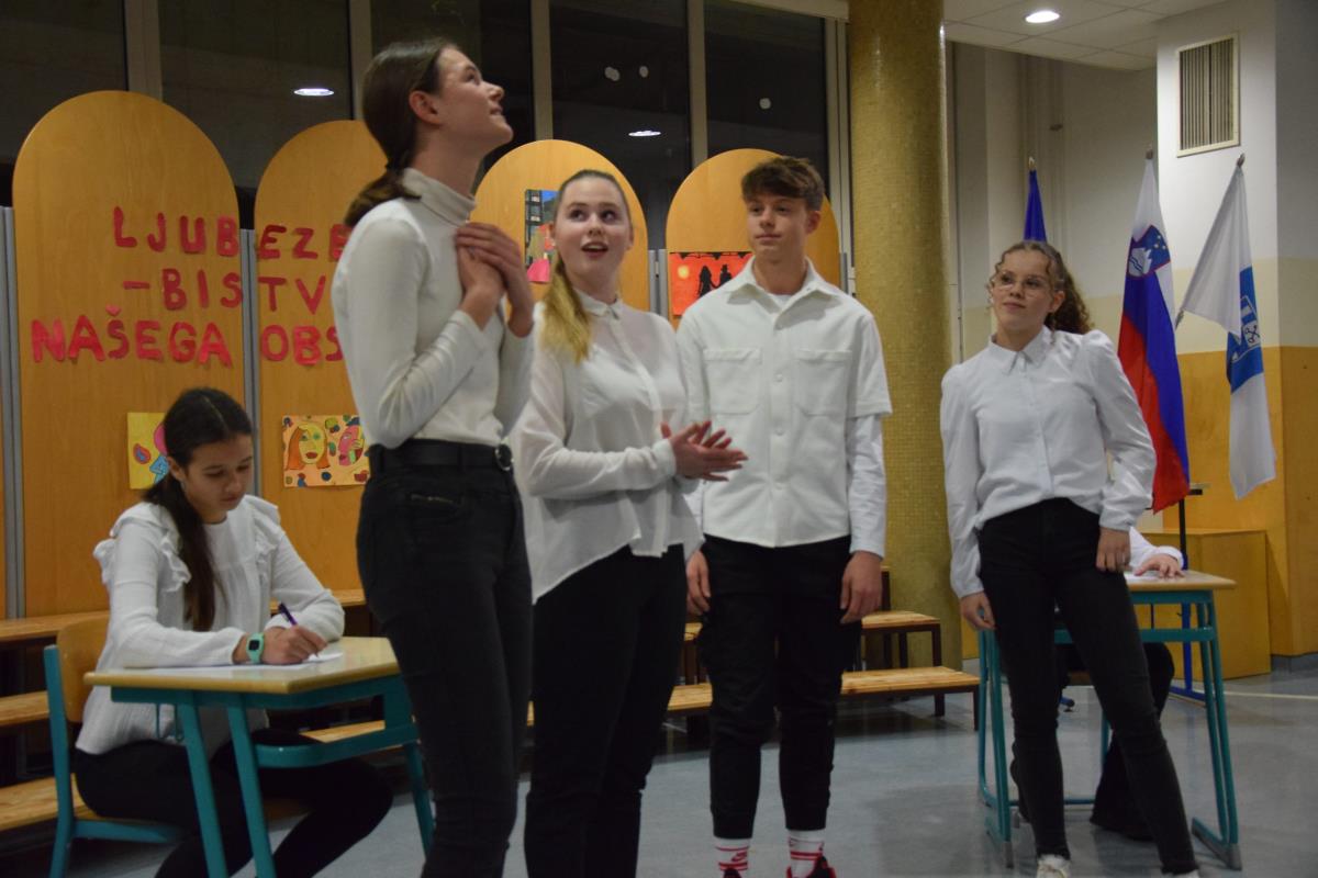 Večkrat so izvrstno nastopili tudi Voranc Bobnar, Sara Borovnica, Meta Merljak, Jera Prestor, Živa Roblek in Rene Rozman, ki so pod vodstvom mentorice – gospe Brigite Košmrlj recitirali ljubezensko poezijo, sestavljeno iz drobcev pesmi naših in tujih pesnikov.