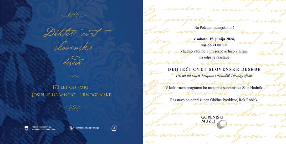 Na Poletno muzejsko noč v soboto, 15. junija 2024, vas ob 21. uri Gorenjski muzej vljudno vabi v Prešernovo hišo v Kranju na odprtje razstave DEHTEČI CVET SLOVENSKE BESEDE – ob 170. letnici smrti Josipine Turnograjske. V kulturnem programu bo nastopila sopranistka Zala Hodnik. Razstavo bo odprl župan Občine Preddvor, Rok Roblek.