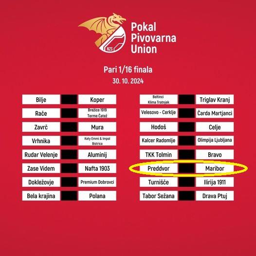 Žreb za 3. krog in 1/16 pokalnega tekmovanja, ki je bil opravljen v ponedeljek, 30.9.2024 na sedežu NZS, je naši članski ekipi namenil prvoligaša z največ lovorikami - MARIBOR! Čestitamo in se že veselimo srečanja, ki bo v sredo, 30.10.2024 ob 14h v novem Športnem parku Preddvor...