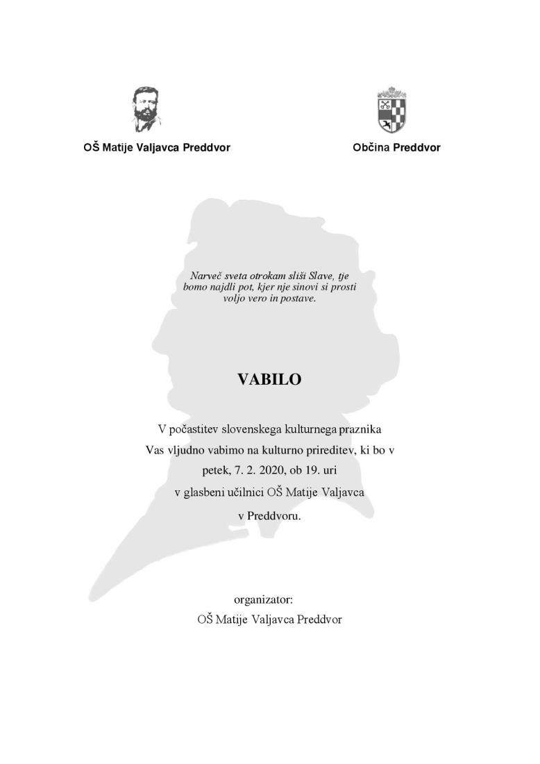 V počastitev slovenskega kulturnega praznika Vas vljudno vabimo na prireditev, ki bo v petek, 7. 2. 2020, ob 19. uri v glasbeni učilnici OŠ Matije Valjavca v Preddvoru. Slavnostni govornik bo župan Rok Roblek, v kulturnem programu pa bodo nastopili učenci in učenke šole. Vabljeni, da z obiskom počastite praznik, ki poudarja kulturo kot temeljni gradnik naše državnosti, kar nas postavlja na izjemno mesto med državami sveta. OŠ Matije Valjavca Preddvor in Občina Preddvor