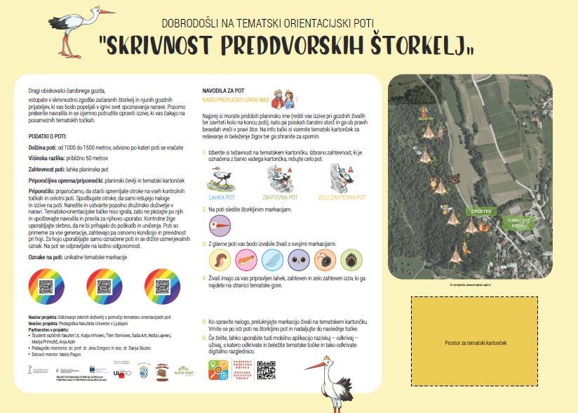 Tematsko orientacijska pot Skrivnost preddvorskih štorkelj je sicer nastala lani v okviru PKP projekta (Po kreativni poti do praktičnega znanja), pri katerem je sodelovalo 6 študentov različnih fakultet Univerze v Ljubljani z mentorji.